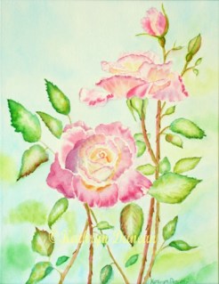 When I was working on this rose painting, “Pink Roses and Bud” I wanted to achieve beautiful pastel pink and yellow roses, attractive shadows, along with a harmonious background. I wanted the leaf edges to be jagged in some places, and the leafs to form an interesting design.