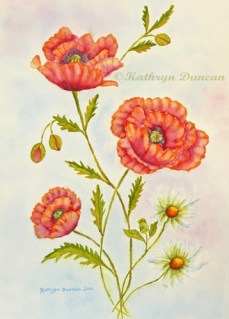 My first poppy painting, “Poppycock” has a very simple background. The focus is mostly on the flowers, leaves, and buds.