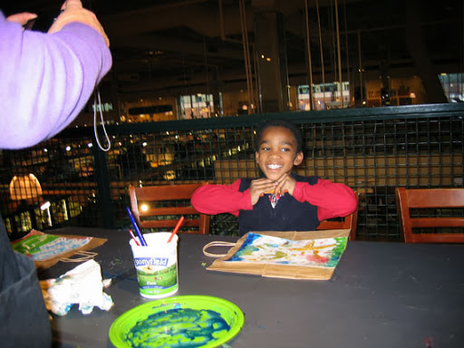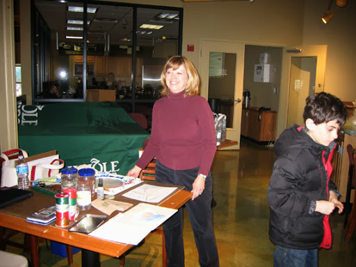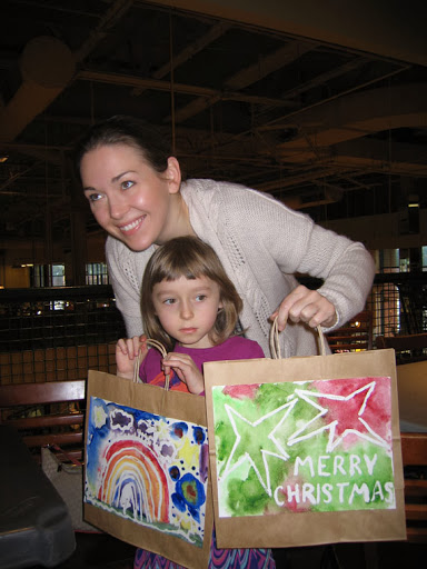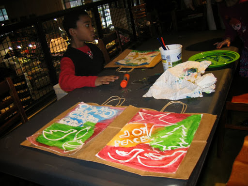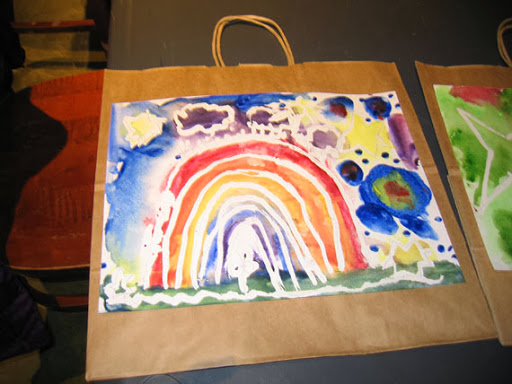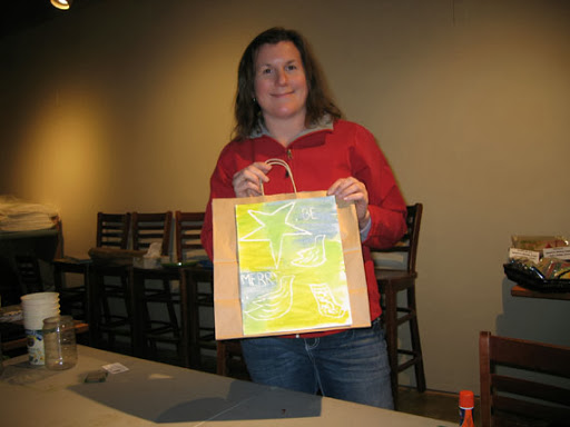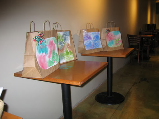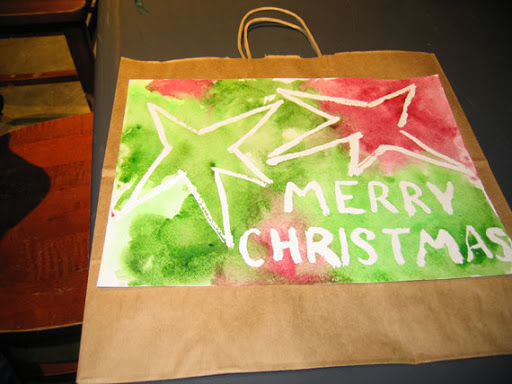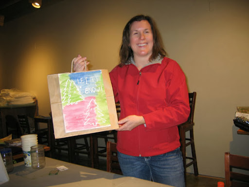 We painted simple watercolor paintings with impressionistic backgrounds, and used liquid frisket to save the whites of our paper. I provided templates for my students to trace, if they wished. Most people used the templates, but not all. Then we glued the paintings onto bags to create our holiday gift bags. This is what the day looked like: