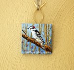 We see Downy Woodpeckers often at our bird feeders. They really like suet, and we keep our hanging feeder stocked with a variety of it, especially in the winter. While at Kensington Park, MI recently, I was amazed and lucky enough to have one of these birds land on my hand and eat seeds from it. They are small birds, and are very sweet and beautiful to look at. I decided to add the Downy Woodpecker to my mini-paintings in acrylics. So fun to paint!