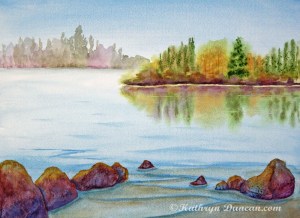 I’ve been doing some landscape watercolor studies recently. I’ve been particularly interested in landscapes with calm waters in them. Here are some of the results, they are 11″x 15″ watercolor on Fabriano Artistico 300 lb cold press paper: