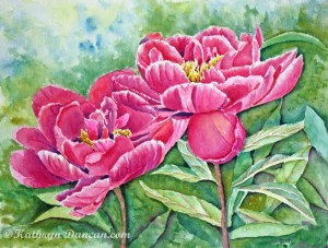 I was thrilled to have red peonies bloom in my garden this year, and I was able to take some wonderful reference photos for inspiration to paint. I painted large red magenta peonies on 12″ x 16″, 300 lb watercolor paper, and matted and framed it to 16″ x 20″. Below is the painting I recently completed. I’m very happy with the results, and just smile every time I look at it.