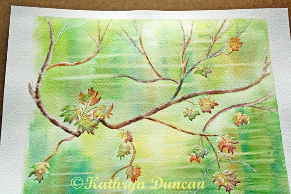 A painting I worked on in my watercolor painting class of maple branches and leaves with water in background.